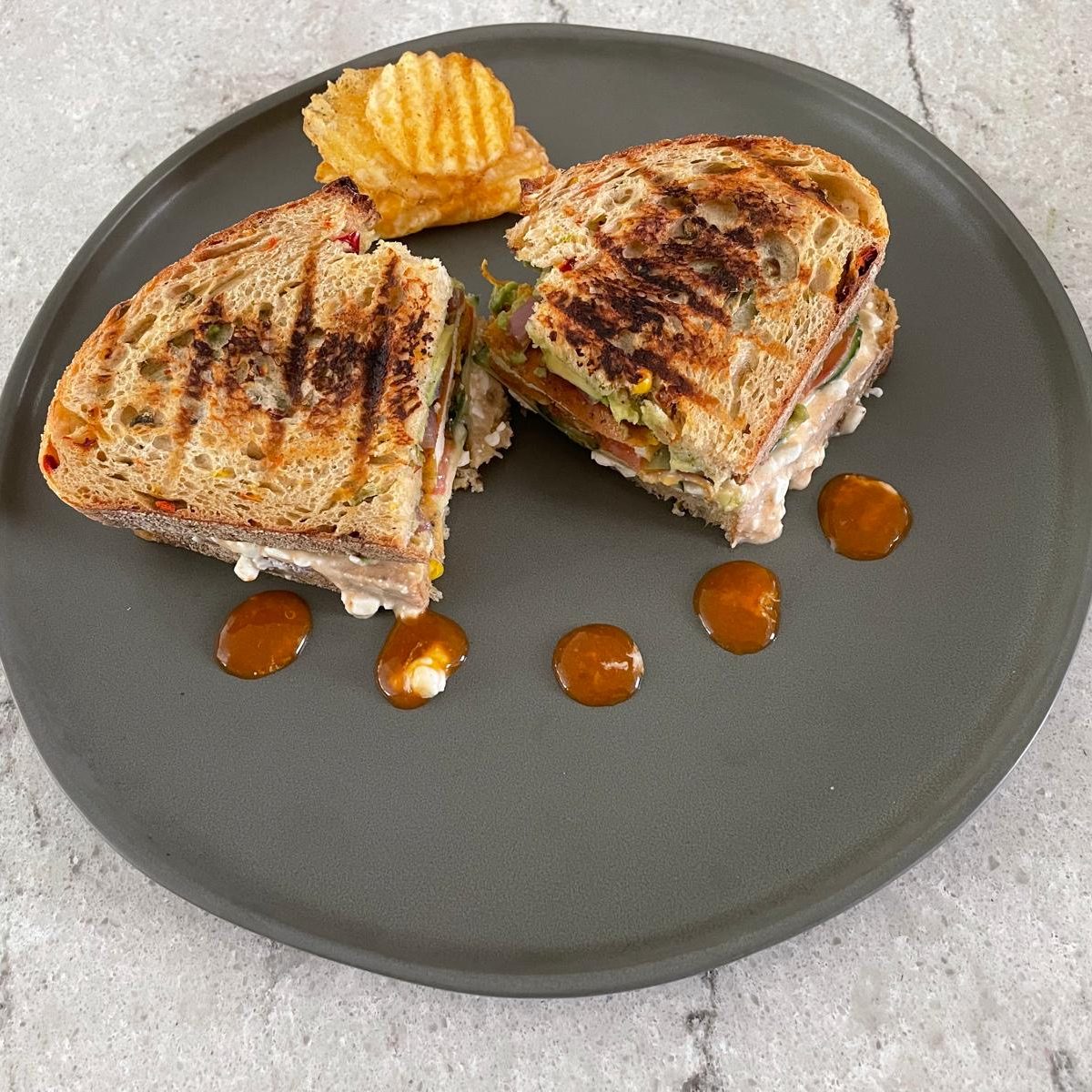 This is an easy, high protein vegetarian sandwich with ~25gm proteins. It can be easily modified to use what you have in your kitchen. I used an airfryer to fry my tofu but you can bake or pan fry it instead. I used Jalapeno Cheddar loaf from Costco but you are free to use your favorite bread.